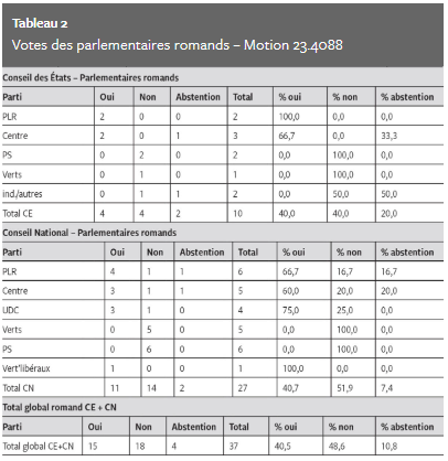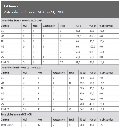 En majorité, les conseillers nationaux des cantons romands présents se sont opposés à cette idée, par 15 voix contre 10 et 4 abstentions. Les Conseillers aux États présents ont accepté, par 5 oui, 4 non et 4 abstentions. Ces résultats illustrent le manque d’information probable d’une partie de nos parlementaires (tableau 1). L’analyse montre cependant un partage qui pourrait être lié à l’appartenance politique. Les propositions de vote favorable, défavorable et abstention ont été : PLR 6,1,1 ; Centre 3,1,2 ; PS 0, 8, 0 ; Verts 0, 6, 0 ; autres 1,1,1 (tableau 2).