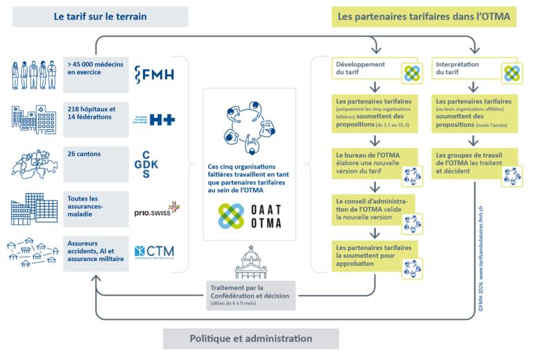 Dans ce contexte, le Parlement a obligé en juin 2021 les fédérations des fournisseurs de prestations et des assureurs à mettre sur pied une organisation tarifaire nationale chargée, selon le nouvel article 47a de la LAMal, « de l’élaboration, du développement, de l’adaptation et de la maintenance des structures tarifaires pour les traitements médicaux ambulatoires ». En dépit de la complexité de la situation, les partenaires tarifaires (la FMH, H+, curafutura, santésuisse et la CTM) ont fondé ensemble l’OTMA en novembre 2022.